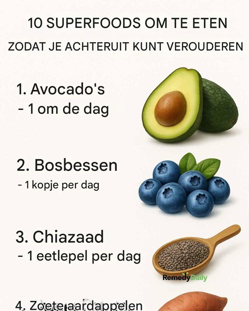 In dit artikel verkennen we tien superfoods die geroemd worden om hun anti-verouderingseigenschappen. Door deze voedingsmiddelen in je dieet op te nemen, kun je hun krachtige voedingsstoffen benutten om op een natuurlijke manier ouder te worden en je huid, hersenen, hart en algehele welzijn te ondersteunen. Van de romige rijkdom van avocado’s tot de levendige kleuren van kurkuma, elk van deze superfoods biedt unieke voordelen die je kunnen helpen de tijd op natuurlijke wijze terug te draaien.