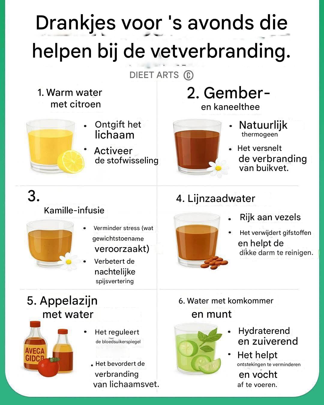 Het kwijtraken van buikvet verbetert niet alleen je figuur, maar is ook essentieel voor de gezondheid van je hart, lever en stofwisseling. Naast een gezond dieet en voldoende beweging kunnen bepaalde natuurlijke drankjes dit proces versnellen, waardoor je vet verbrandt, je lichaam ontgift en ontstekingen vermindert . Hieronder laten we je 20 natuurlijke drankjes zien die helpen bij het verbranden van buikvet en hoe je ze in je dagelijkse routine kunt opnemen.