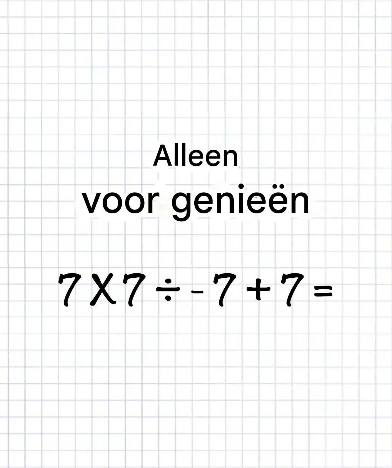 7 × 7 ÷ 7 – 1 + 7. Klinkt simpel, toch? En toch… dit soort vergelijkingen circuleren op sociale media met een uitdaging: « Vind het antwoord in minder dan 10 seconden. » Het resultaat? Meer dan de helft van de mensen heeft het fout. Ben jij ook meteen aan de berekening begonnen? Wacht even… het is misschien niet zo makkelijk als het lijkt. Eén cruciaal detail verandert alles.