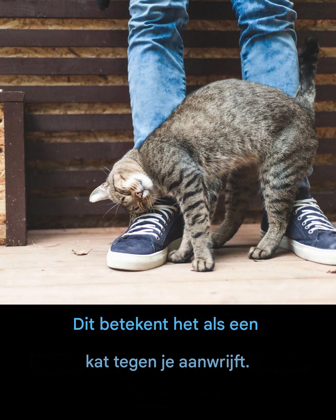 In eerste instantie lijkt het misschien alsof je kat je probeert te laten struikelen of je persoonlijke ruimte binnendringt , maar in werkelijkheid is het een van de meest zachte manieren waarop een kat genegenheid kan tonen. Door tegen je aan te wrijven, zegt je kat: « Ik vind je leuk. Jij hoort bij mijn wereld. »