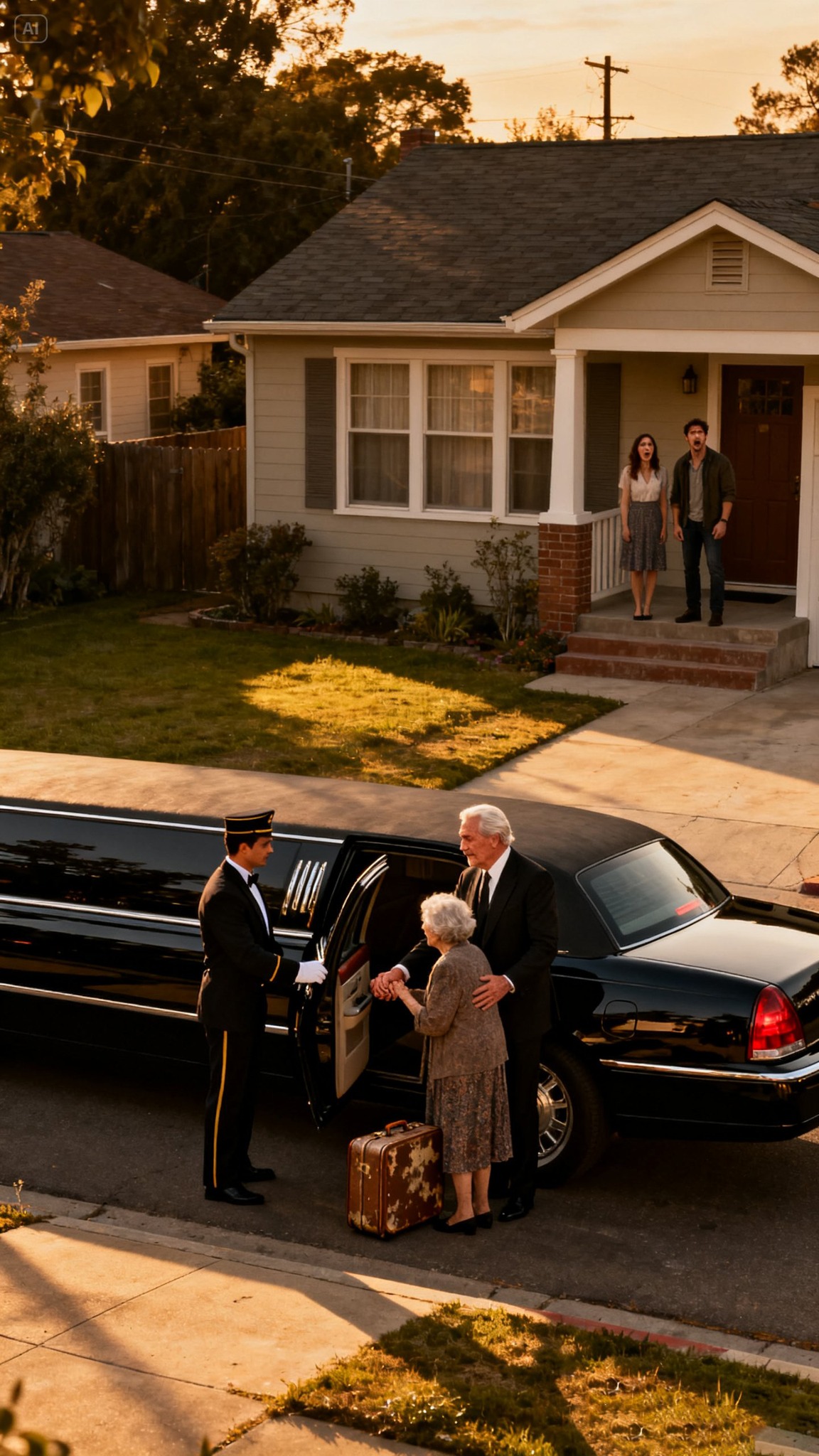Een uur later stopte een strakke zwarte limousine voor de stoeprand, de glanzende carrosserie weerspiegelde de grijze middaghemel. Toen mijn zoon de voordeur opendeed en zag wie me kwam ophalen, verdween de zelfvoldane glimlach van zijn gezicht. Het was alsof de grond onder zijn voeten was weggezakt.