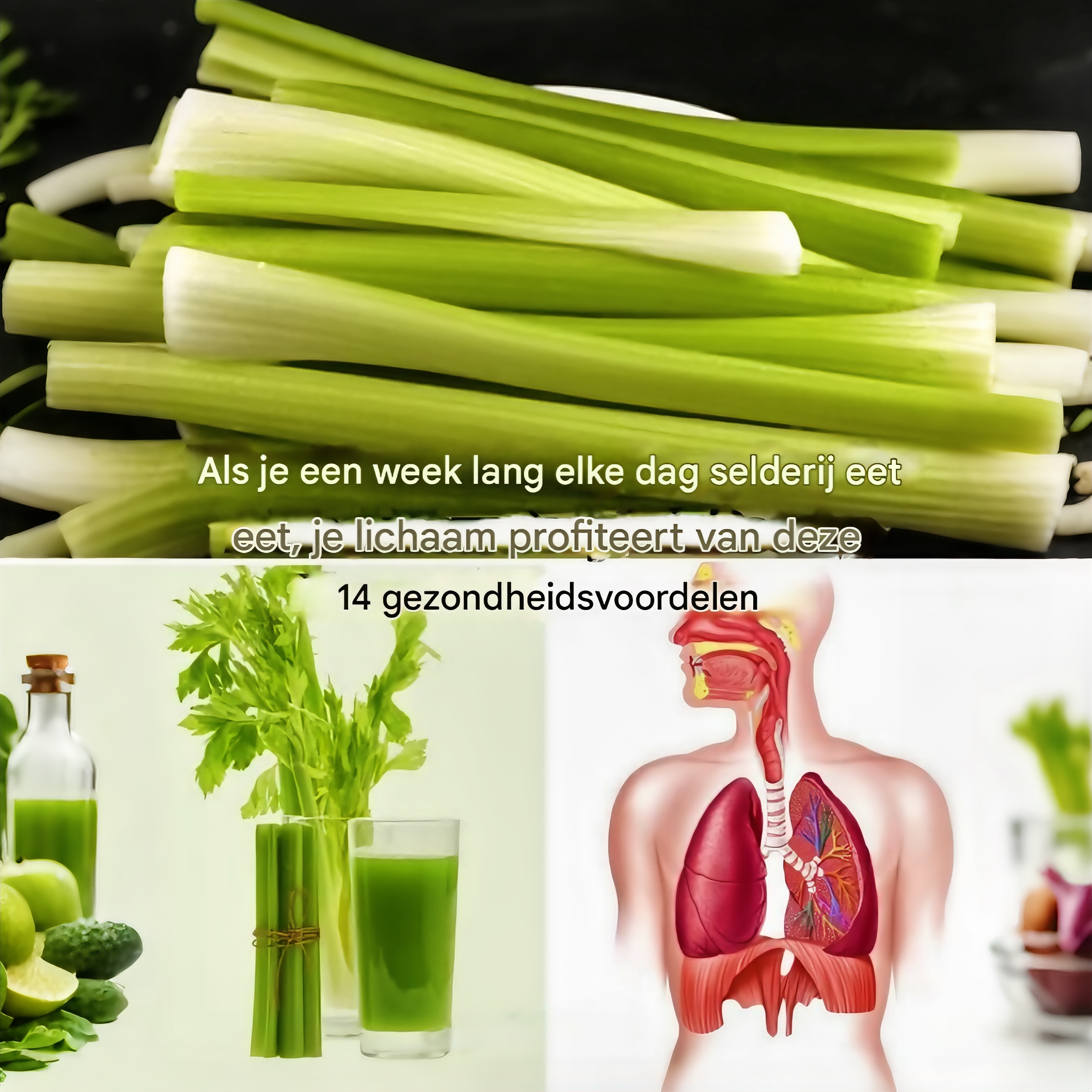 . Met zijn hoge watergehalte (bijna 95%) is selderij een uitstekende manier om gehydrateerd te blijven. Voldoende vochtinname is essentieel voor lichaamsfuncties zoals temperatuurregeling, voedingstransport en smering van gewrichten.