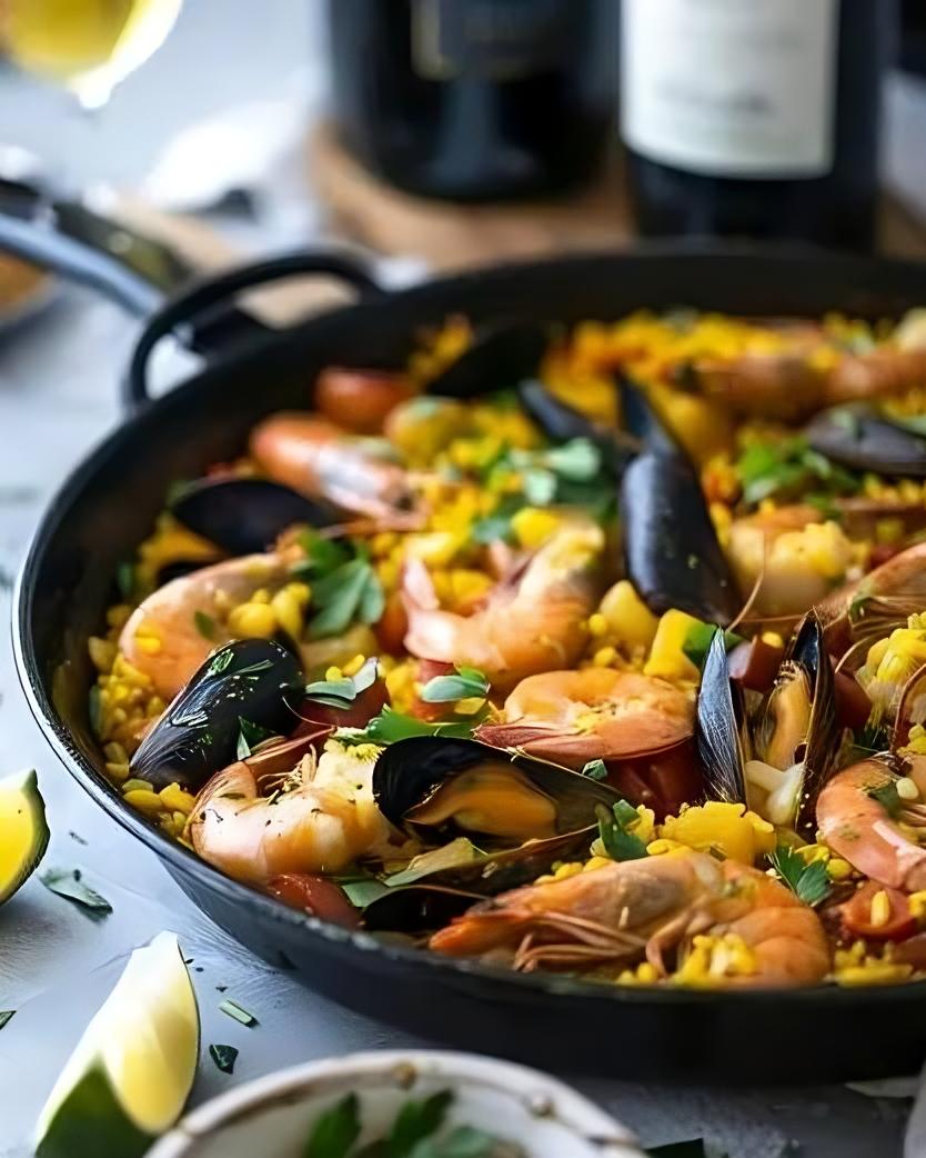 Paella is misschien wel het meest iconische gerecht uit Spanje, en de Paella Valenciana wordt door velen beschouwd als de meest authentieke versie, afkomstig uit de regio Valencia. Traditioneel bevat deze paella kip, konijn, sperziebonen (garrofó en bajoqueta) en soms slakken, gekookt boven een houtvuur. Dit recept is een populaire variant die ook zeevruchten bevat, wat technisch gezien meer neigt naar een ‘Paella Mixta’, maar desalniettemin heerlijk is. De sleutel ligt in de kwaliteitsingrediënten, de juiste rijst, de smaakvolle bouillon en natuurlijk de kostbare saffraan die zorgt voor die kenmerkende kleur en aroma. En vergeet de socarrat niet – het licht aangebakken, knapperige laagje rijst op de bodem van de pan!
