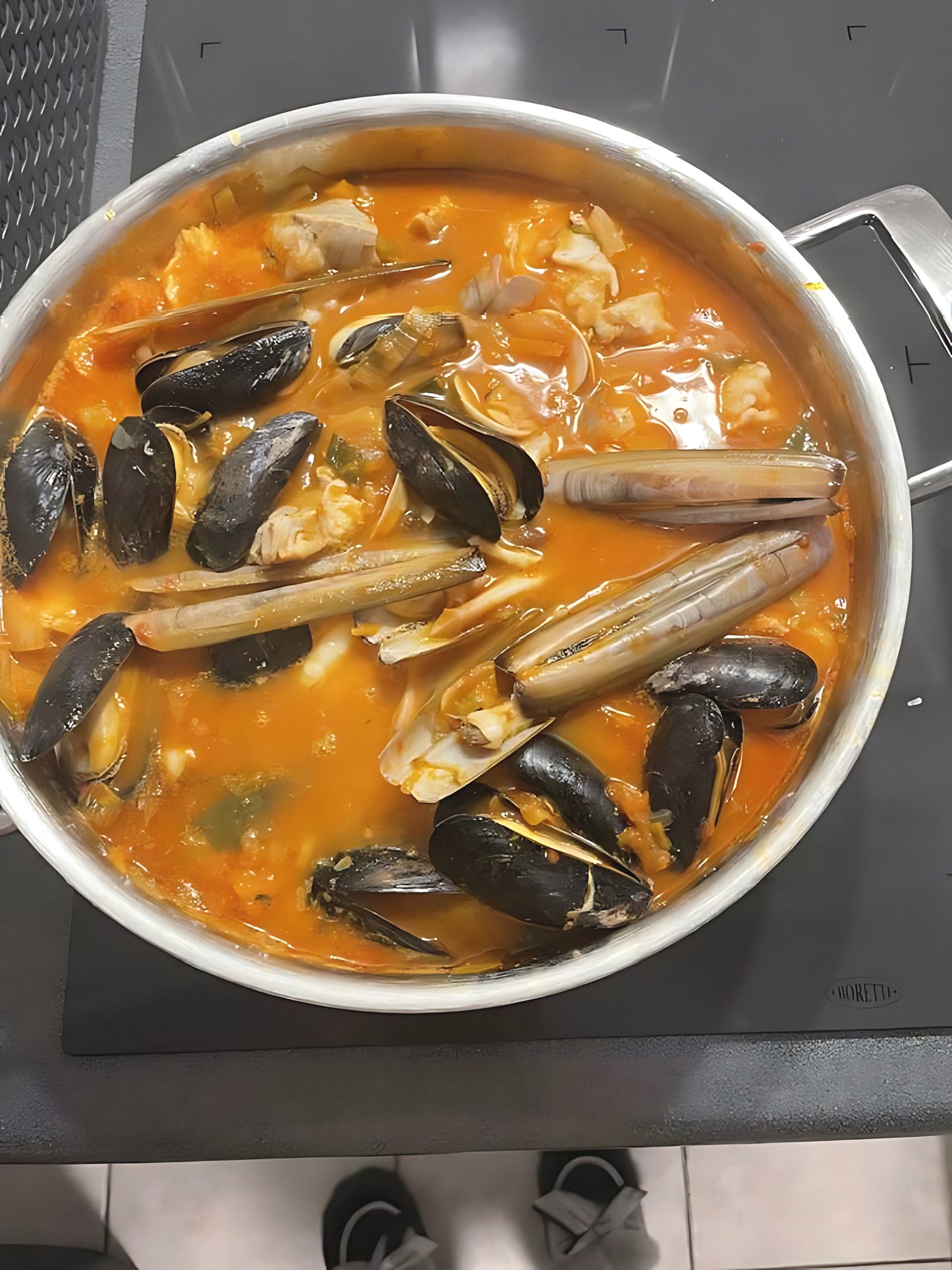 Ingrediënten Groente: 1 grote ui 1/2 prijs 2 stengels wit zout 2 woorden 1 chilipeper (om te bakken, met of zonder zout) 1 rode paprika Schroef en schild: 300 g vongole (venusschelpen) 300 g mossel (goud) 300 g scheermesjes 300 g grote garnalen 300 g rode paprika 300 g bouillon 300 g lijn Roken en … Lire plus