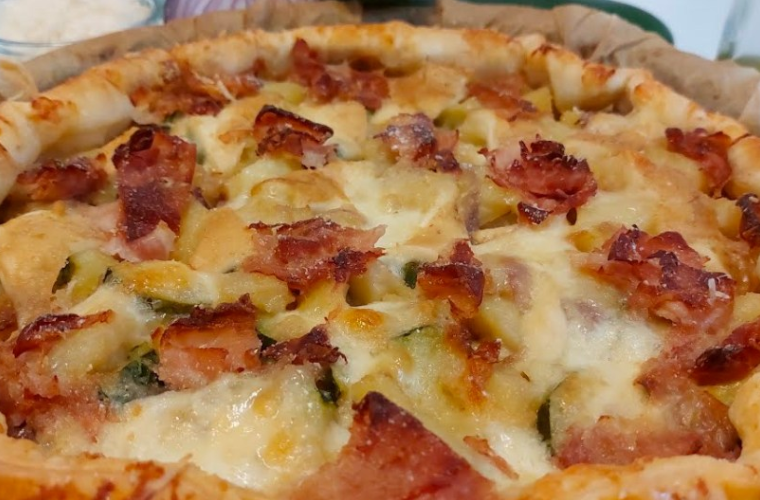 Ingrediënten: 1 ronde rol bladerdeeg 5 aardappelen 1 courgette 1/2 rode ui 1/2 glas water 1/2 gerookte provola 3-4 plakjes gekookte ham geraspte Parmezaanse kaas naar smaak paneermeel naar smaak Extra vergine olijfolie Voorbereiding: Vervolg op tweede pagina