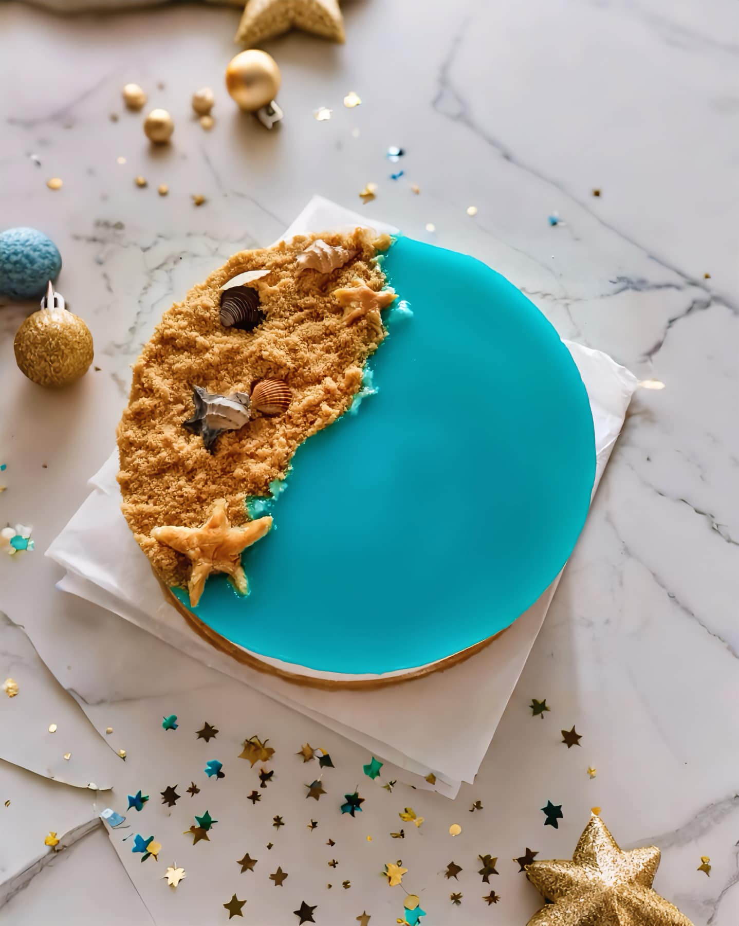 Breng de zomer naar je tafel met deze prachtige cheesecake geïnspireerd door de zee. Een perfect samenspel van frisse citroen, romige lagen en decoraties die doen denken aan zand, zee en schelpen. 👩‍🍳✨