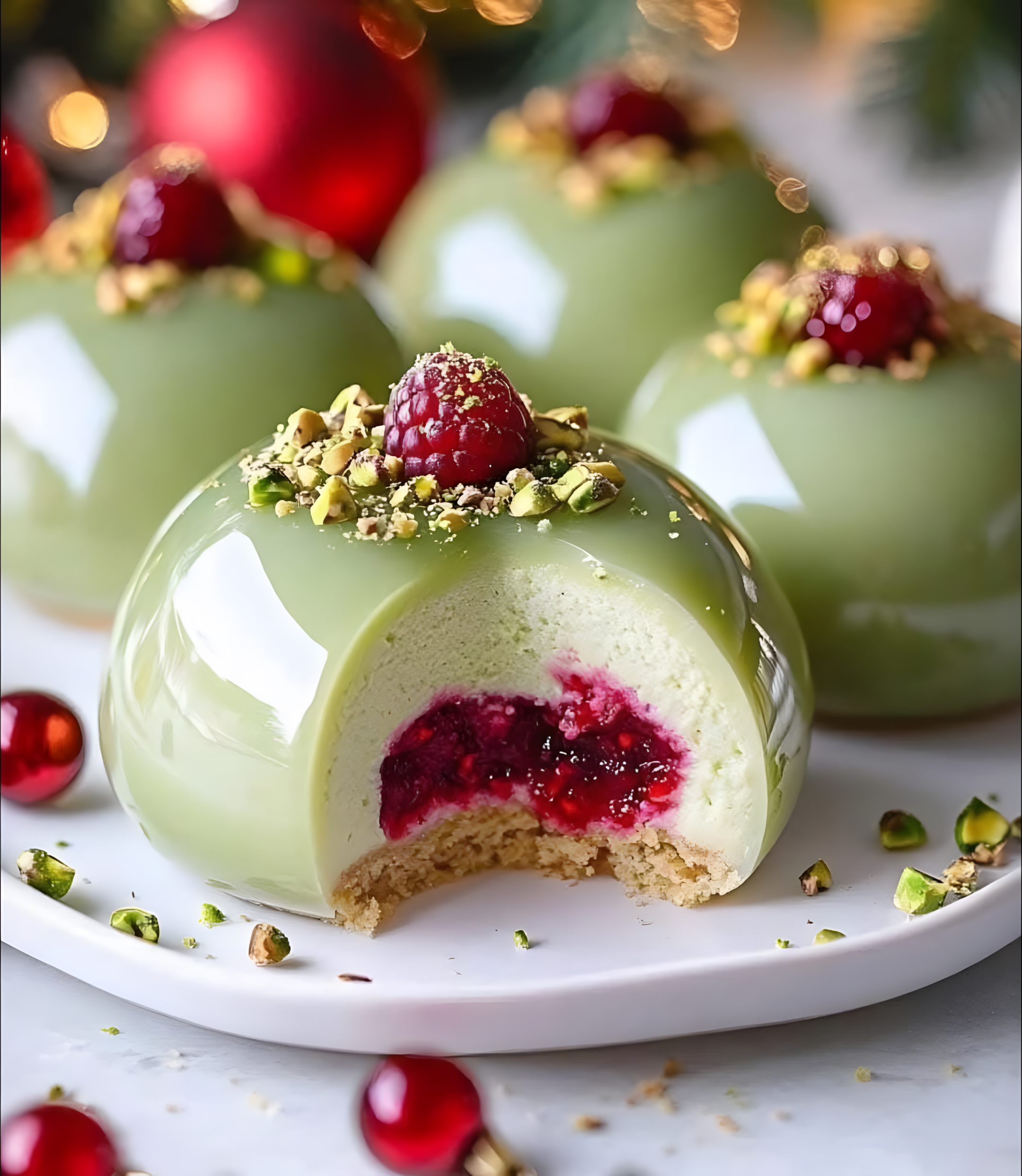 Deze romige cheesecake cupola’s combineren de intense smaak van pistache, de frisheid van frambozen en de zoetheid van witte chocolade. Perfect voor een chique dessert, met een glanzende spiegelglazuur en een zijdezachte textuur! 😍