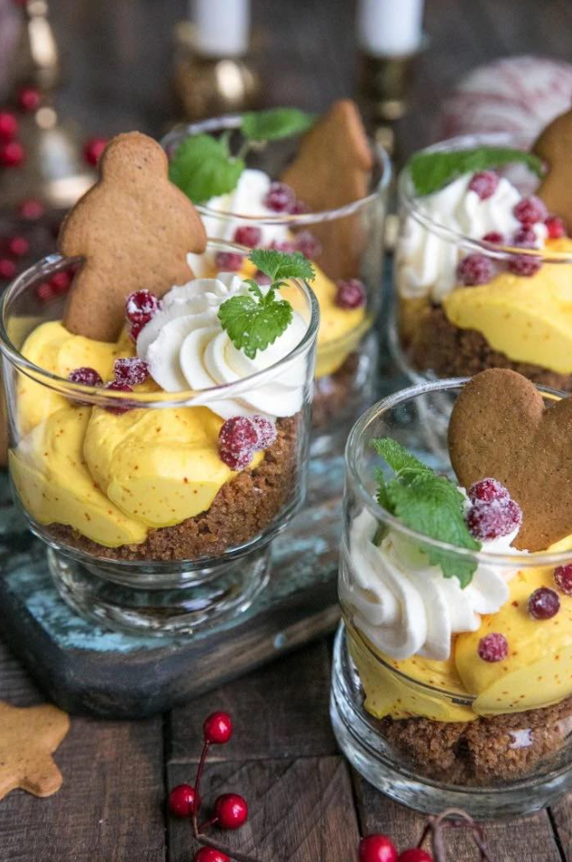 Maal of verkruimel de peperkoekkoekjes tot fijne kruimels. Meng de kruimels met de gesmolten boter, zodat je een licht plakkerige, kruimelige basis krijgt. Verdeel dit mengsel over de bodem van vier glazen en druk het heel licht aan. Door niet te stevig aan te drukken blijft de bodem luchtig en makkelijk eetbaar met een lepel.
