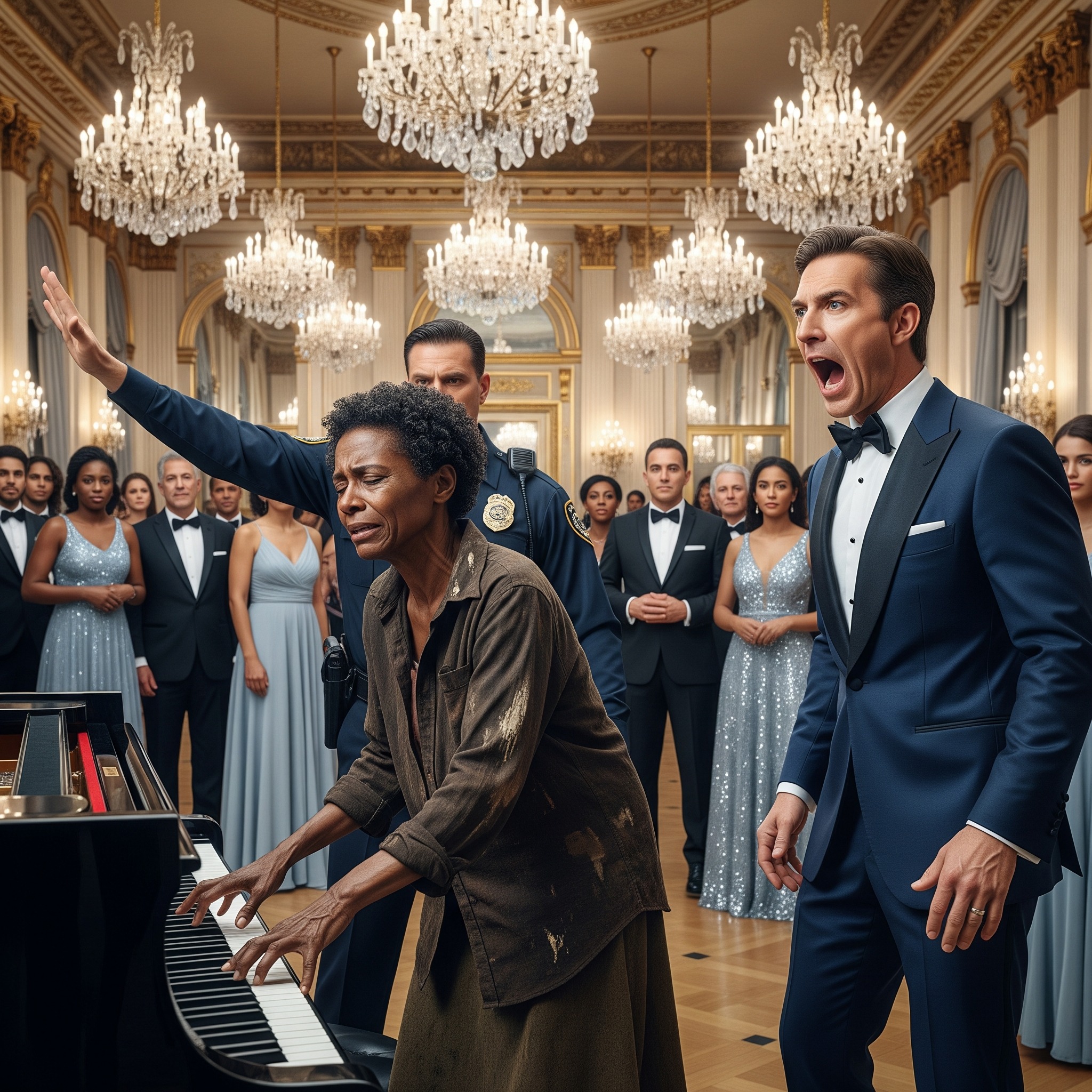 De menigte week uiteen om Lawrence Carter, de legendarische pianist en eregast, naar voren te zien stappen. Met zijn zilvergrijze haar, waardig en de stille autoriteit van iemand die decennialang podia over de hele wereld had gedomineerd, bekeek hij de vrouw met iets wat leek op nieuwsgierigheid – niet op een oordeel.
