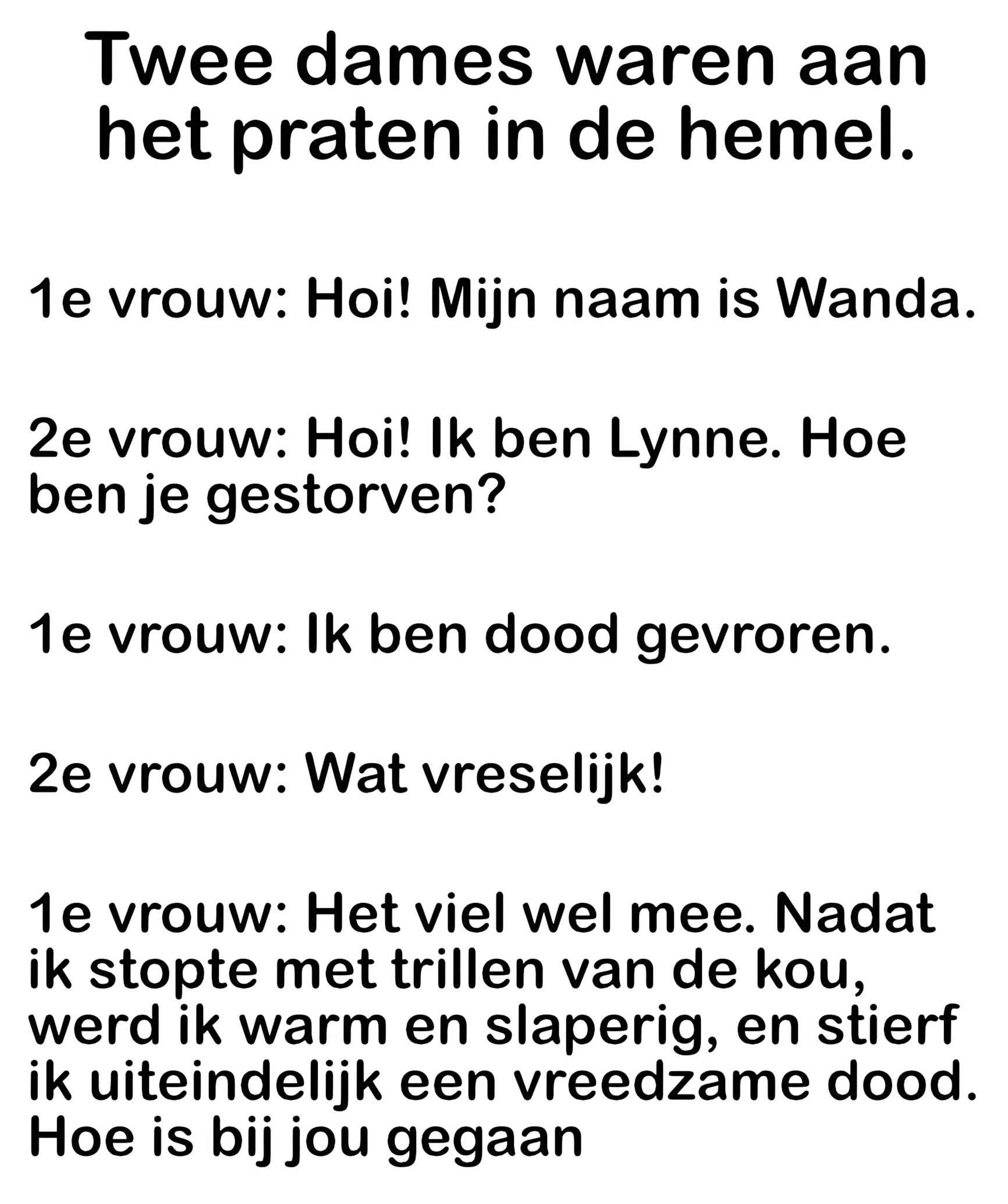 Ik kwam onlangs een bijzonder grappig verhaal tegen dat ik niet voor mezelf kon houden! Dit is een komische voorstelling van hoe een ontmoeting tussen twee vrouwen in de hemel eruit zou kunnen zien, waarin ze hun verhalen delen over hoe ze daar zijn beland.