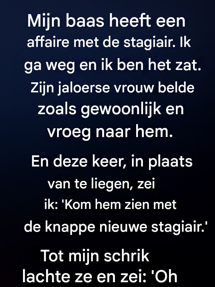 De geruchten begonnen stilletjes. Gefluisterd over hem en de nieuwe stagiair. Nachtelijke vergaderingen die nergens op sloegen. Gelach achter gesloten deuren. Ik zei tegen mezelf dat ik erbuiten moest blijven – dat het mijn zaken niet waren. Maar na verloop van tijd veranderde de energie op kantoor. De spanning werd dik genoeg om te voelen.