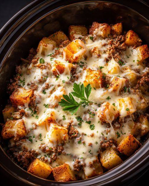 3. Kaas smelten: Voor een extra goudbruine, bubbelende bovenlaag kun je de kaas aan het einde 2-3 minuten onder de grill zetten in plaats van hem gewoon in de slowcooker te laten smelten. Houd het wel goed in de gaten, want het kan snel van goudbruin naar verbrand gaan.