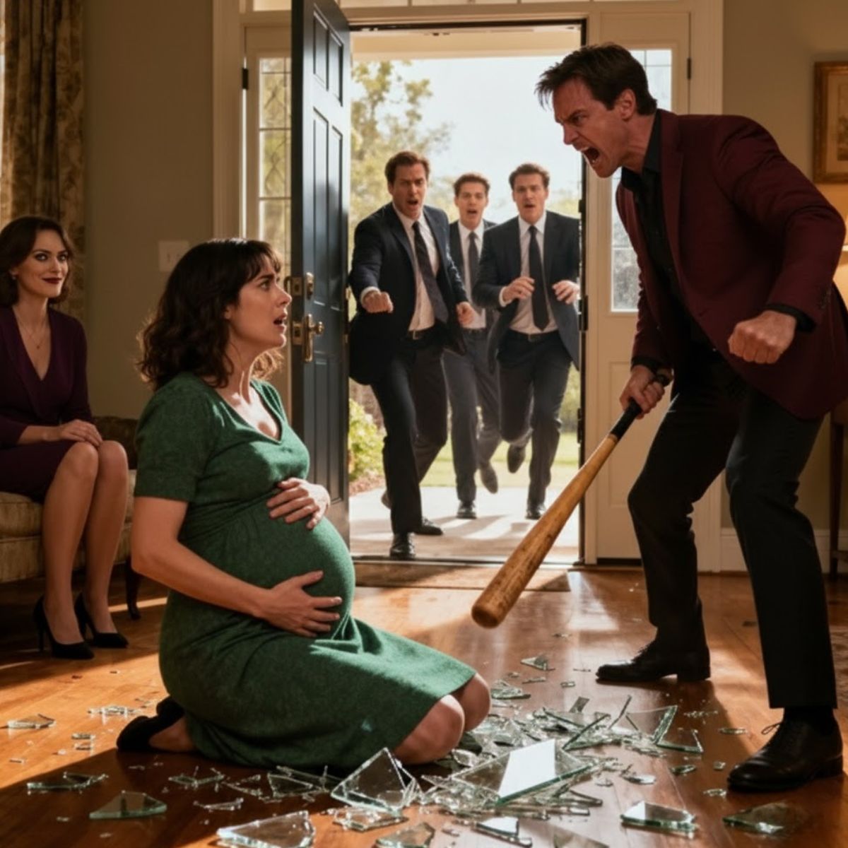 Ethans gezicht vertrok. Hij antwoordde niet. In plaats daarvan liep hij naar de hoek van de woonkamer en pakte een honkbalbat, waarvan het gepolijste hout glansde in het schemerlicht. Clara’s ogen werden groot van schrik. « Ethan, alsjeblieft – ik draag jouw kind! » riep ze, terwijl ze achteruit deinsde. Haar lichaam probeerde instinctief het leven in haar te beschermen, maar haar angst verlamde haar.