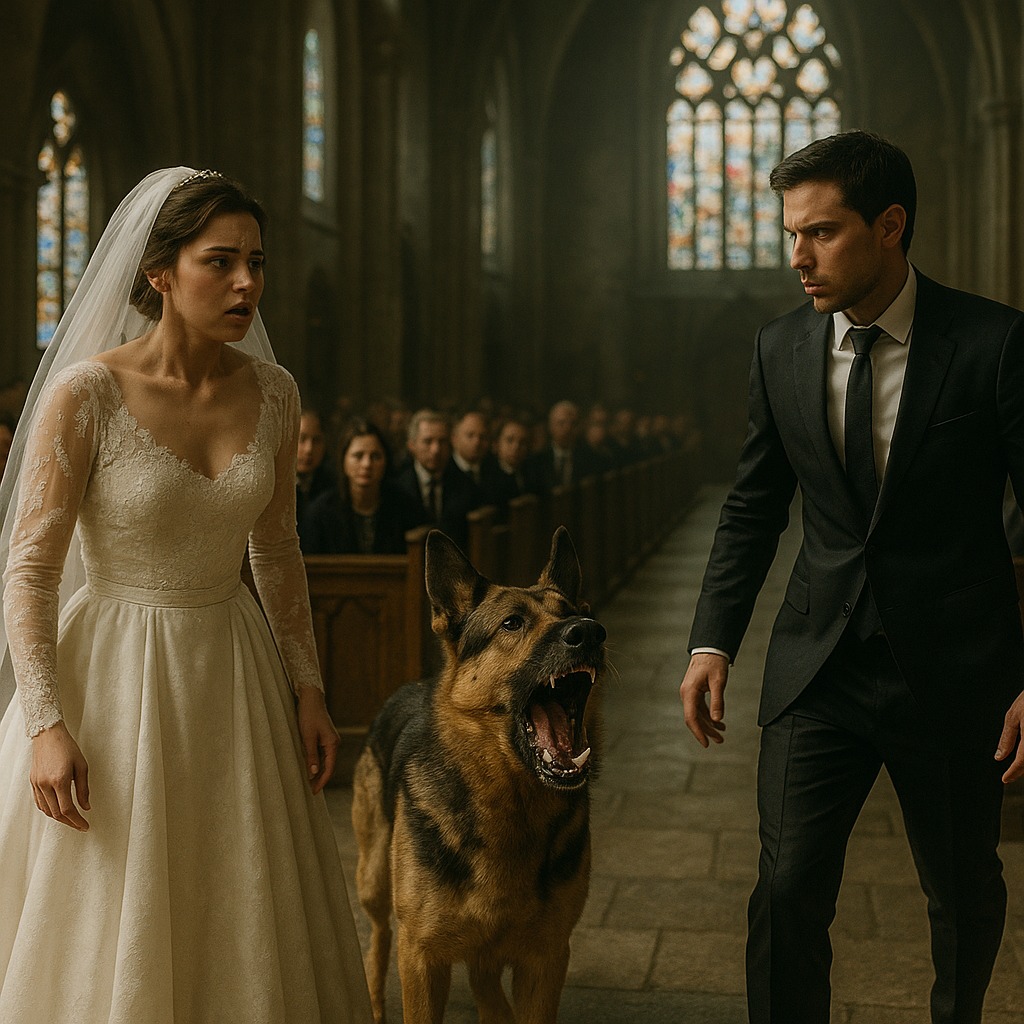 Het had de gelukkigste dag van haar leven moeten zijn. Emily Carter zette haar eerste stap naar het altaar, stralend, trillend en glimlachend door haar tranen heen. Maar toen gebeurde er iets wat niemand had verwacht. Aan het einde van het gangpad stond haar Duitse herder, Buddy, haar de weg te versperren, grommend en weigerend haar verder te laten gaan. De gasten hapten naar adem. « Van wie is die hond? » fluisterde iemand.