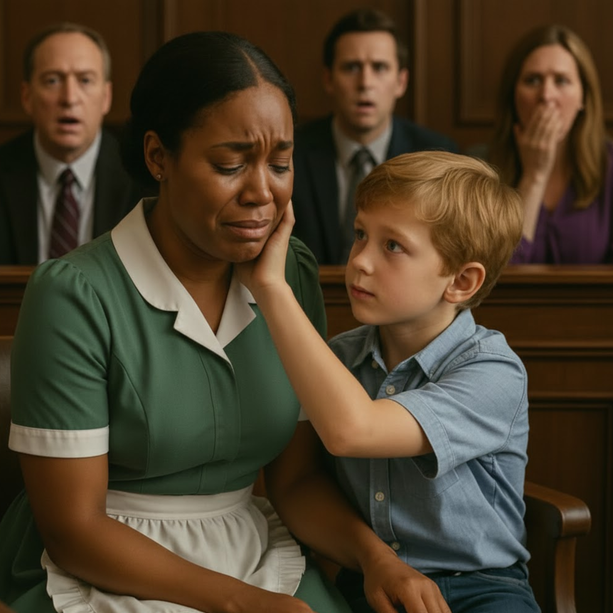 Iedereen ging ervan uit dat ze schuldig was; het woord van de rijken woog zwaarder dan haar tranen en haar waarheid. Maar toen alle hoop verloren leek, gebeurde er iets bijzonders. De jonge zoon van de miljonair – die haar als een tweede moeder beschouwde – ontsnapte aan zijn nanny, rende de rechtszaal in en onthulde een schokkend geheim dat alles zou veranderen.