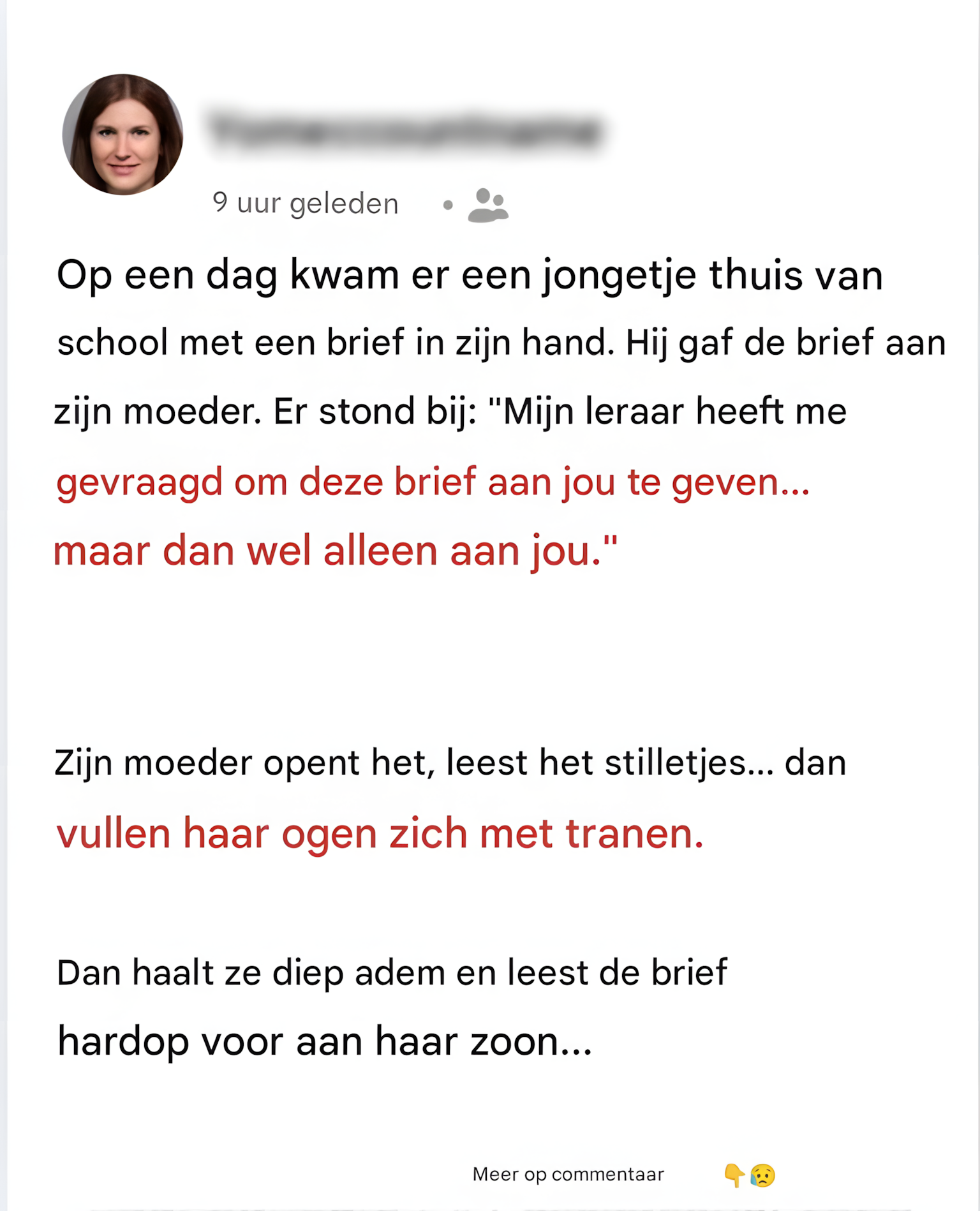 Zijn moeder opent het, leest het stilletjes… dan vullen haar ogen zich met tranen.