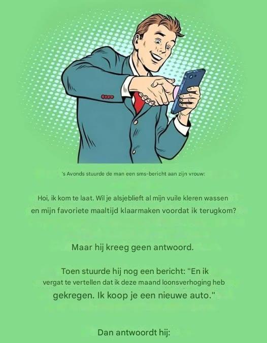 Dan probeert hij het wat ondeugender te doen: « Ik vergat je te vertellen dat ik loonsverhoging kreeg! » « Ik koop een nieuwe auto voor je. » Deze keer was het antwoord onmiddellijk: « Oh mijn God, echt waar? »