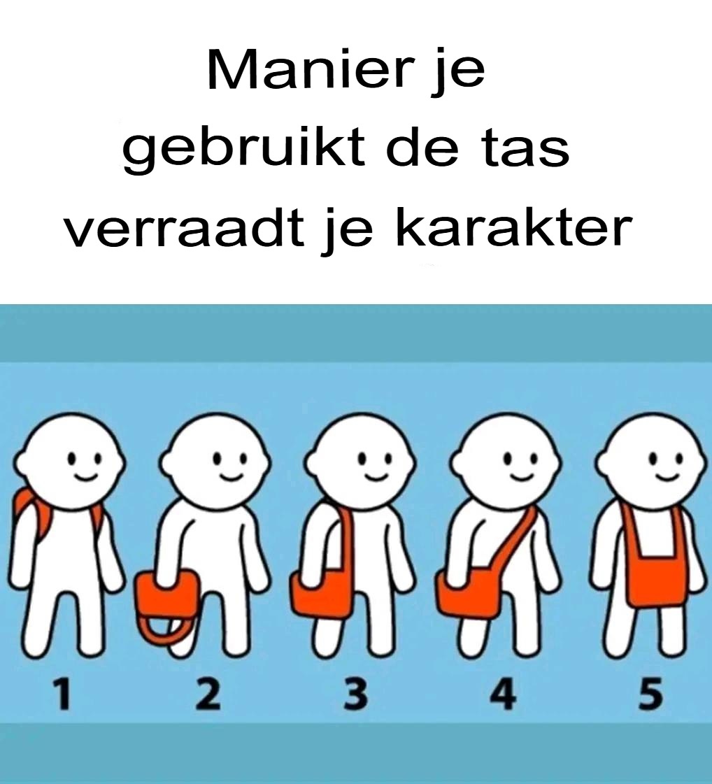 2. In de hand dragen Als je je tas en andere spullen graag in de hand draagt, betekent dit dat je alles graag volledig zelf wilt doen en overal de controle over wilt hebben. Je wilt altijd op de hoogte blijven van wat er speelt en je hebt overal een mening over. Je bent een eenvoudig persoon, maar ook betrouwbaar.