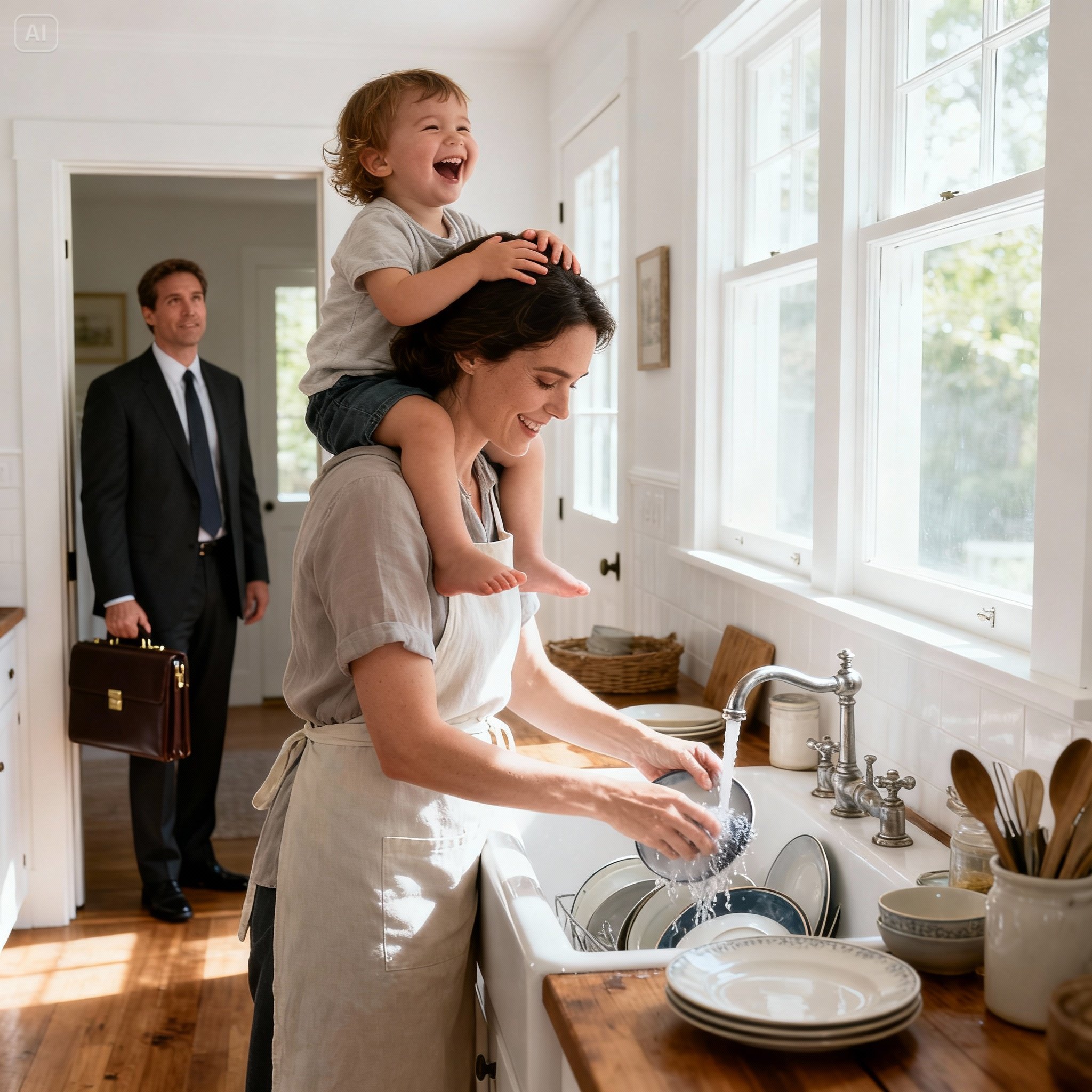 Op een stevige houten stoel zat Ava, haar kleine handjes ondergedompeld in zeepsop naast een jonge vrouw die Michael tijdens zijn gehaaste ochtenden nauwelijks opmerkte. Paige Collins, de nieuwe huishoudhulp, lachte zachtjes terwijl ze Ava’s vingers over een bord leidde.