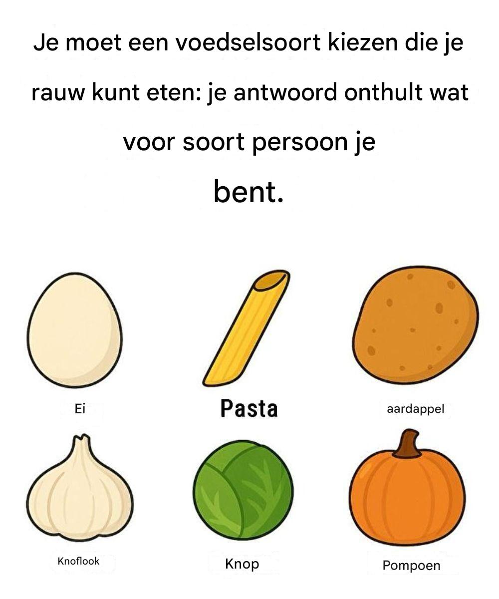 Soms kan een simpele suggestie tot verrassend inzichtelijke reflectie leiden. Zie het als een luchtige persoonlijkheidstest: een leuke quiz die je met vrienden en familie kunt delen aan de eettafel of via de telefoon. Het spel is als volgt: als je één voedselsoort rauw zou mogen eten – eieren, pasta, aardappelen, knoflook, taugé of pompoen – welke zou je dan als eerste kiezen? Jouw keuze in deze speelse ‘rauwe persoonlijkheidstest’ kan je sterke punten, je stijl en je manier van omgaan met kleine uitdagingen in het leven onthullen.