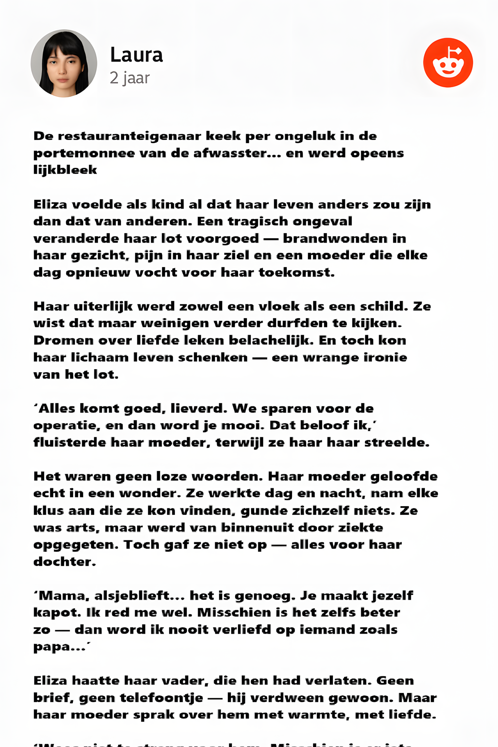 ‘Alles komt goed, lieverd. We sparen voor de operatie, en dan word je mooi. Dat beloof ik,’ fluisterde haar moeder, terwijl ze haar haar streelde.