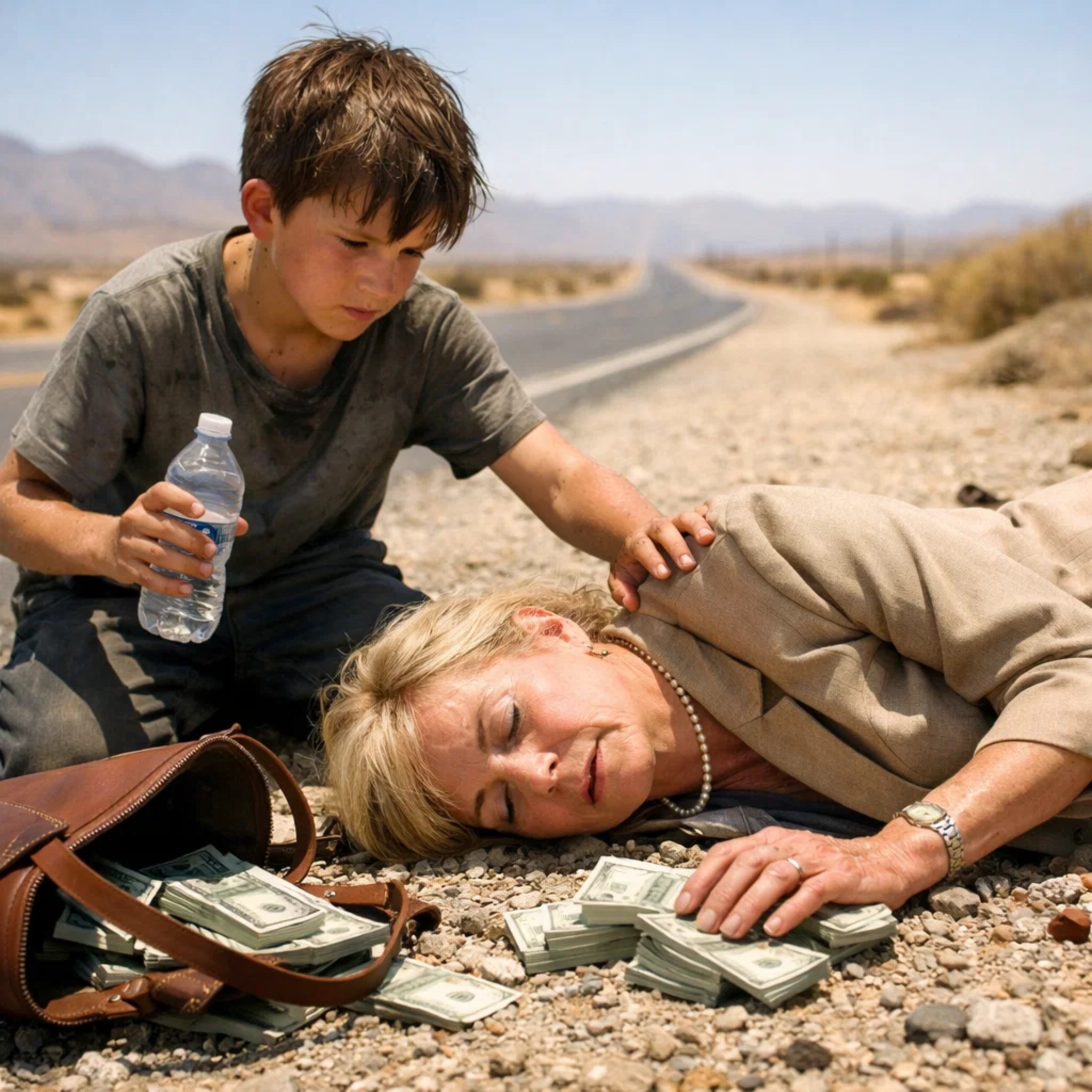 Met brandende inspanning trok ze de auto naar de berm, zette de alarmlichten aan en schakelde de motor uit. Haar handen trilden toen ze de deur opende, in de verwachting dat de woestijnwarmte haar wakker zou schudden – maar zodra haar voet de grond raakte, begon de grond hevig te draaien.