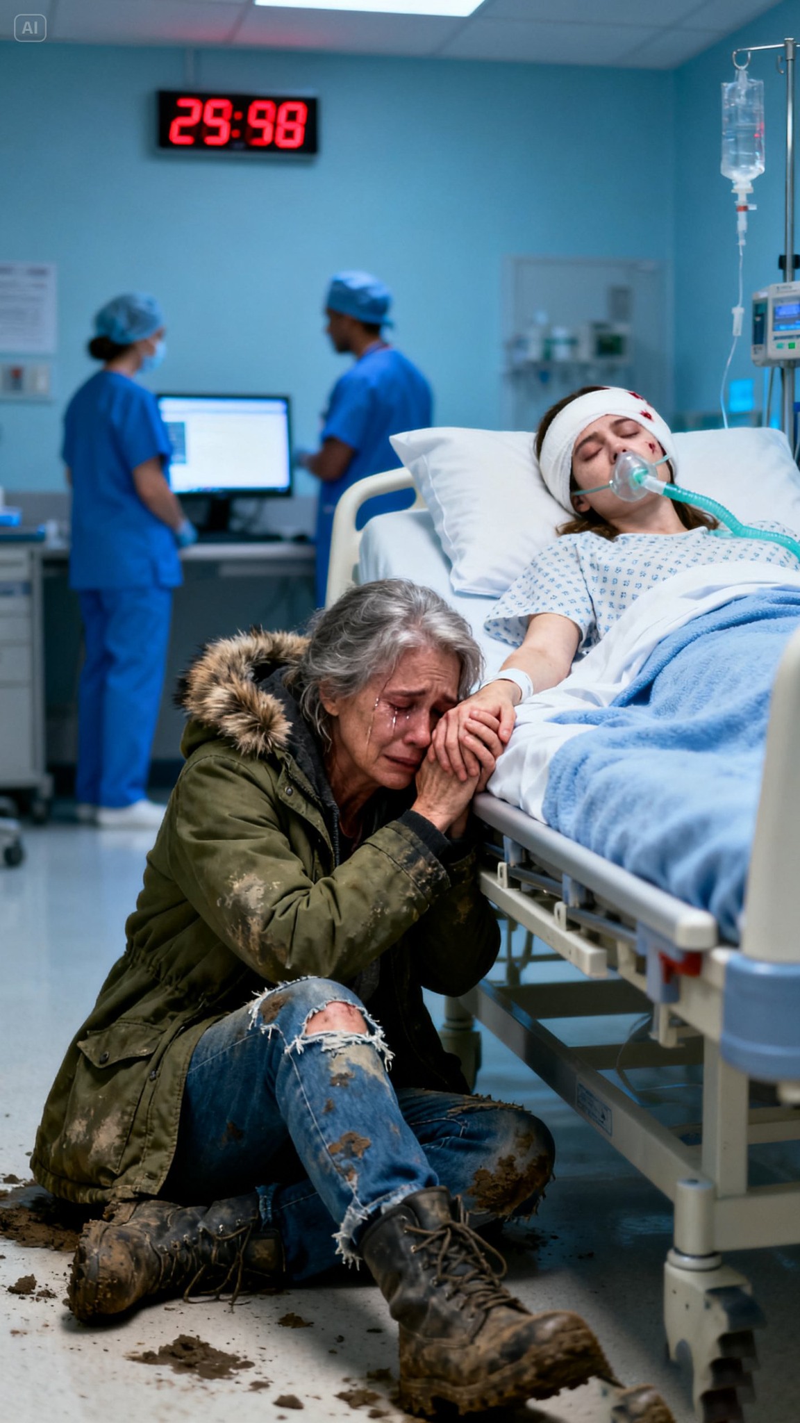 De telefoon gilde om 4:45 uur. Het was mijn schoonzoon, zijn stem druipend van minachting. « Zij is nu jouw probleem. Kom haar ophalen op het bureau. » Ik vond haar ineengedoken op een koude bank, haar gezicht een masker van paarse blauwe plekken en verbrijzelde botten. Met haar laatste adem riep ze: « Mam… ze hielden niet op. » De hartmonitor gaf een vlakke lijn aan en er knapte iets in me – niet in verdriet, maar in ijskoud. Ik pakte mijn spullen en ging naar het huis dat ze haar thuis noemde. Ze dachten dat ze veilig waren achter gesloten deuren. Ze waren vergeten dat ik de reservesleutel nog had. Ik stak hem in het slot, draaide hem geruisloos om en stapte de donkere gang in waar ze sliepen.
