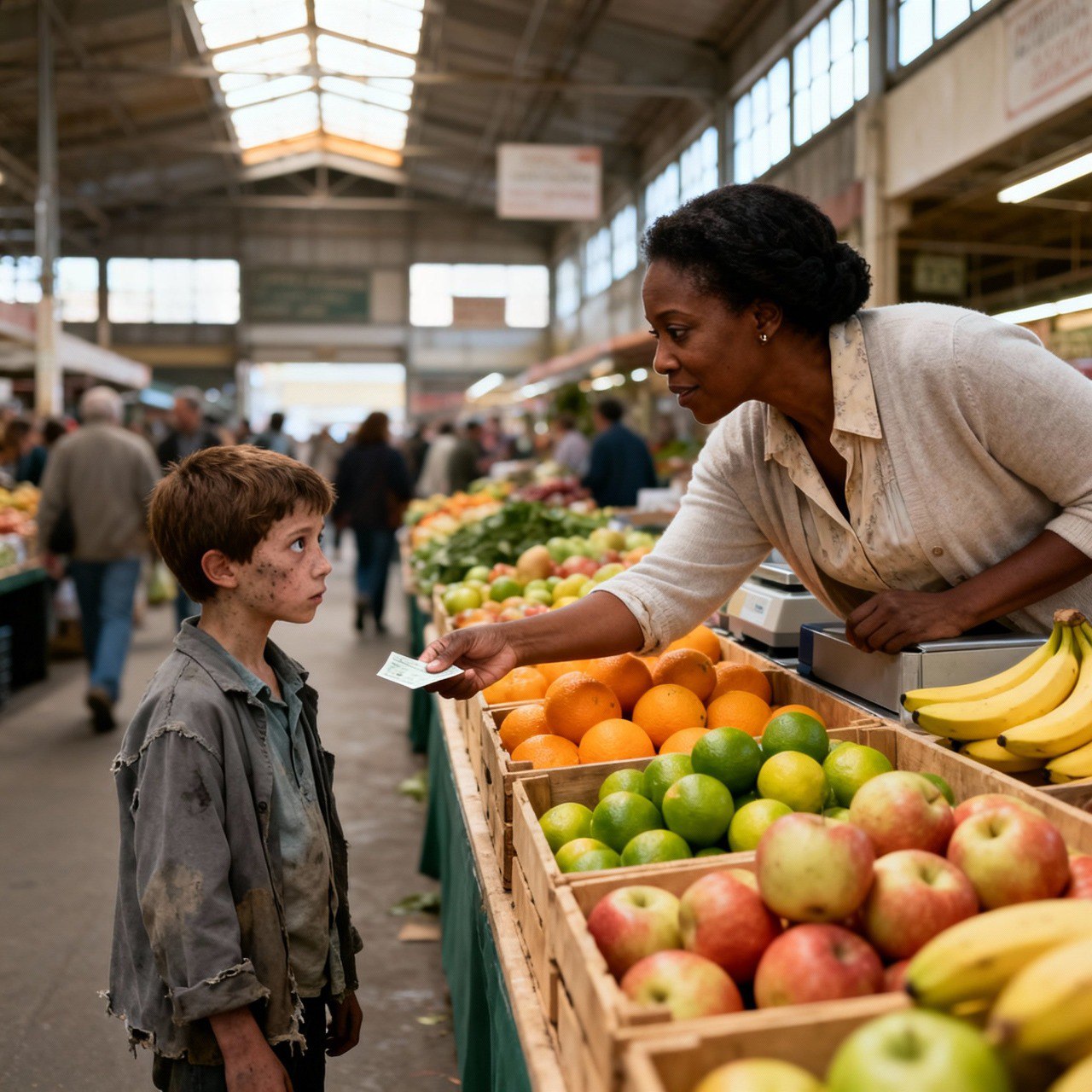 Die middag, terwijl hij rondkeek naar restjes eten, viel zijn blik op een vrouw die fruit verkocht. Ze was in de vijftig, Afro-Amerikaans, met vermoeide ogen maar een warme glimlach. Ze zag de jongen naar een mand met appels staren, zijn lippen droog van de dorst.
