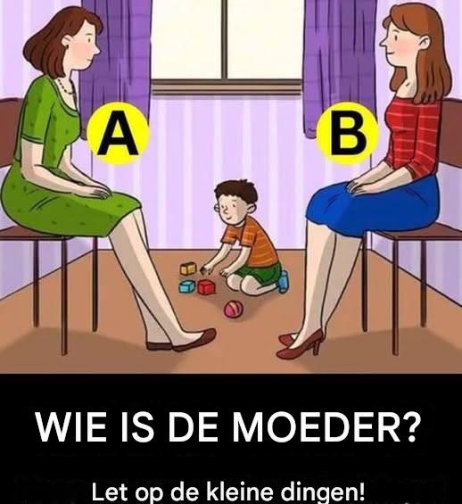 Hoe weten we dat? Haar benen wijzen naar het kind en ze leunt iets naar voren – een natuurlijke, onbewuste beschermende houding. Het kind kijkt haar op zijn beurt aan. Kinderen draaien zich instinctief naar de ouder die ze het meest vertrouwen. Deze subtiele, instinctieve gedragingen verraden het.