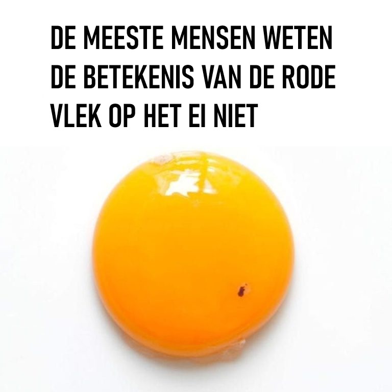 Nee, dit is geen teken van bevruchting of een « oud » ei, zoals we soms horen. In werkelijkheid is dit kleine roodachtige vlekje niets meer dan een klein bloedvaatje. Tijdens de eivorming in het lichaam van de kip barst er soms een klein bloedvaatje, waardoor een afdruk in de dooier achterblijft. Dit is noch ongebruikelijk , noch abnormaal, en bovenal helemaal niet gevaarlijk.