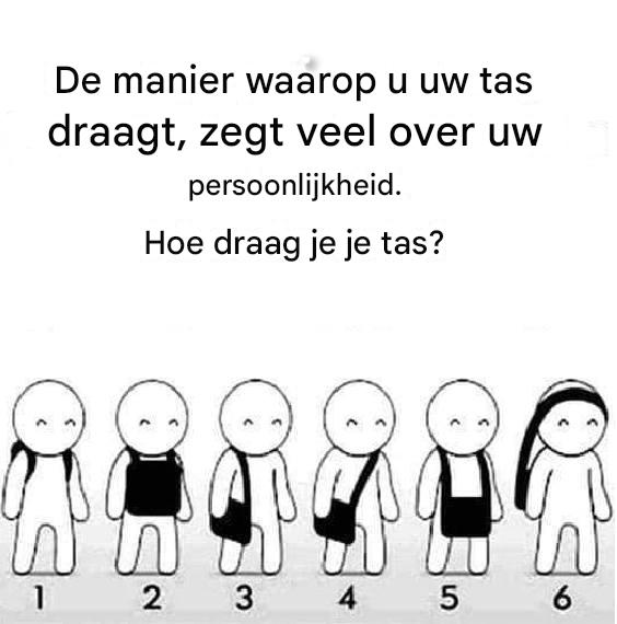Als je een handtas draagt, suggereert dit dat je graag alles netjes en opgeruimd houdt. Mensen die hun tas op deze manier dragen, hebben vaak een sterk gevoel van controle en organisatie. Je hebt oog voor detail en let op de kleine dingen in het leven. Deze stijl suggereert dat u bewuste beslissingen neemt en er altijd goed over nadenkt voordat u actie onderneemt.