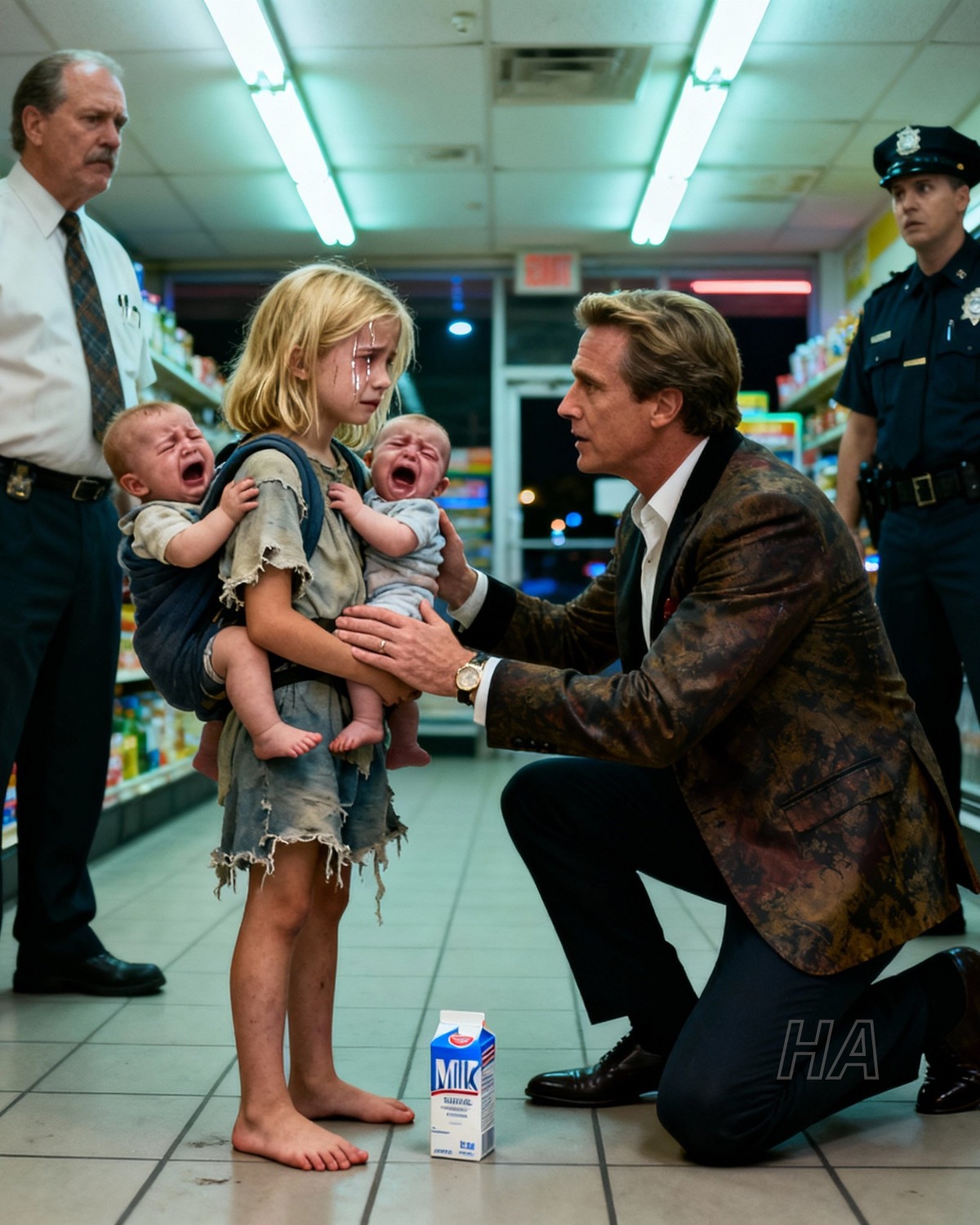 De nachtlucht was koud en scherp toen de kleine Emily Carter , amper tien jaar oud, een klein pakje melk tegen haar borst klemde. Haar kleine handjes trilden – niet van schuldgevoel, maar van angst. Achter haar klonken de wanhopige kreten van haar twee jongere broertjes en zusjes vanuit een donker steegje in de buurt. Ze hadden bijna twee dagen niet gegeten. De glinsterende lichten van de stad trokken zich er niets van aan. Mensen liepen voorbij zonder de drie hongerige kinderen op te merken, dicht opeengepakt in de schaduw van wolkenkrabbers.