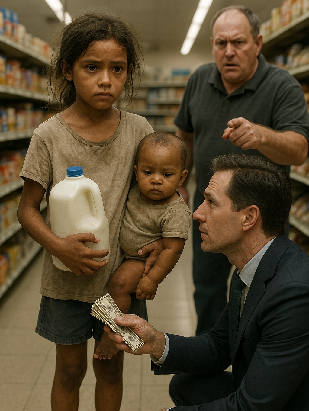 Het meisje vertrok haar gezicht, maar bewoog niet. Ze legde de baby in haar armen en keek omhoog – recht naar de lange man die net de winkel was binnengekomen. Een man in een marineblauw maatpak. Een man die iedereen herkende.