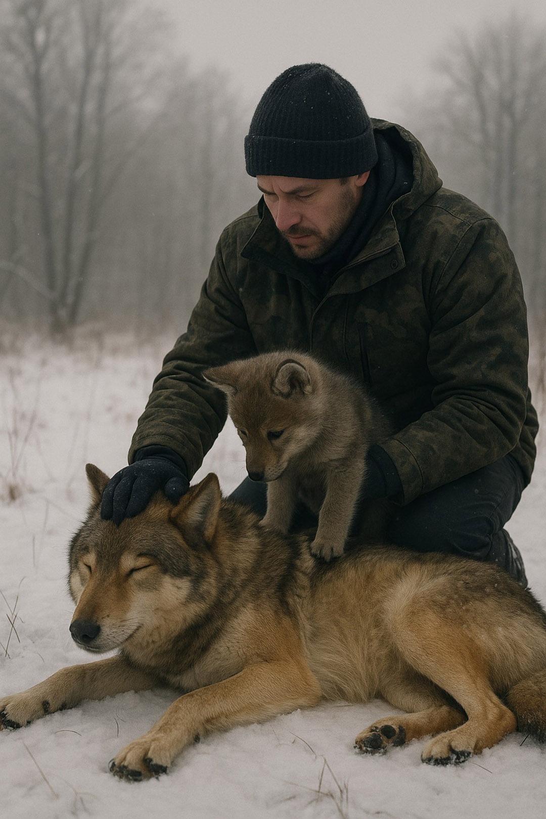 Na een moment van aarzeling zette hij zijn tas neer en naderde met uiterste voorzichtigheid. Hij besefte dat de wolf vastzat in een verlaten constructie en zichzelf niet kon bevrijden. Langzaam, zonder abrupte bewegingen, gebruikte hij methodisch zijn gereedschap om haar te bevrijden. Vervolgens beschermde hij het dier met zijn jas tegen de kou, deed een stap achteruit en vertrok zonder te wachten. Hij verwachtte niets terug. Hij had simpelweg zijn geweten gevolgd en mededogen getoond voor de natuur.