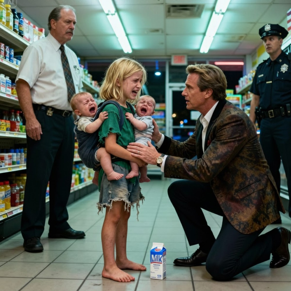 Op dat moment kromp het hart van de miljonair ineen. Hij zag geen dief, maar een kind dat door de wereld in de steek was gelaten. Een stilte viel over de winkel toen hij langzaam opstond en zijn portemonnee tevoorschijn haalde. « Ik betaal alles wat ze nodig heeft, » zei hij tegen de manager. Vervolgens, zich tot de agent wendend, voegde hij eraan toe: « Er is hier vanavond geen misdaad gepleegd, alleen een noodkreet. »