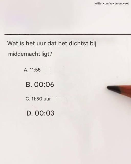 De vraag, die meer dan 1,4 miljoen keer bekeken werd, bood vier opties: A. 11:55, B. 00:06, C. 11:50 en D. 00:03. Veel gebruikers leken in de war en gaven verschillende antwoorden in de reacties.