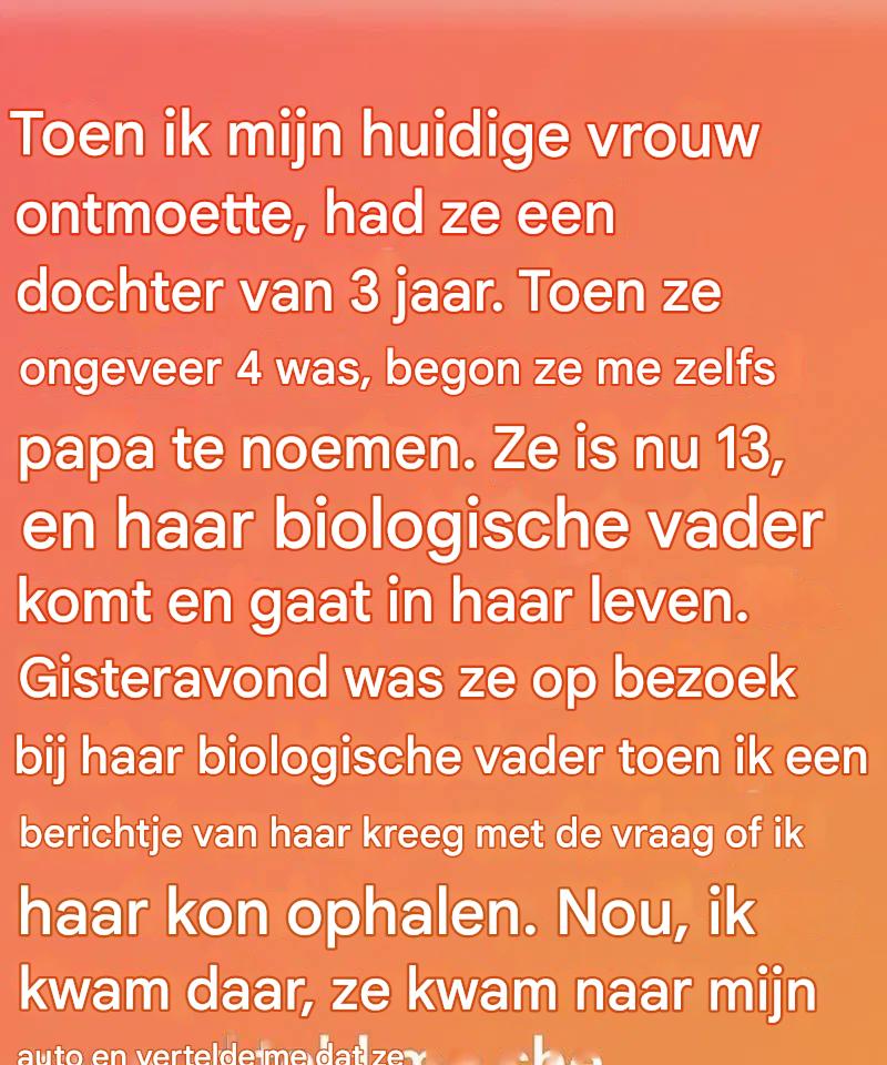 Ze begon me « papa » te noemen toen ze nog maar vier jaar oud was. Ik had het haar niet gevraagd, en ik had het ook niet verwacht. Het glipte er vanzelf uit, alsof haar hart al wist wat haar lippen zeiden. Op dat moment realiseerde ik me iets diepgaands: liefde heeft niet altijd biologie nodig om echt, blijvend en diep betekenisvol te zijn.