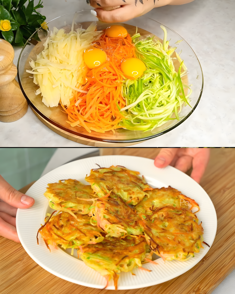 Deze knapperige pannenkoekjes zijn gemaakt van een mix van wortel, aardappel en courgette – een gezonde en smaakvolle keuze voor elk moment van de dag.
