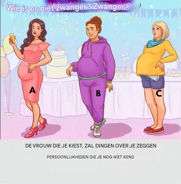 De puzzel van vandaag is simpel maar lastig: van drie vrouwen is er één niet zwanger. Jouw taak is om binnen 5 seconden te achterhalen wie wel zwanger is.
