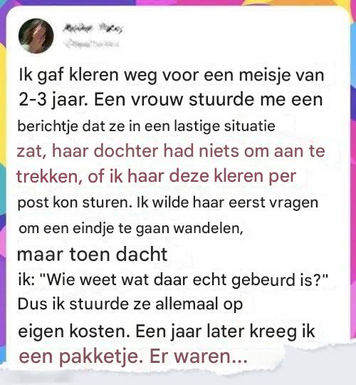 In plaats van alles in te pakken voor opslag of ze bij een donatiebak te laten vallen, had ik een gedachte: misschien is er een klein meisje dat deze echt kan gebruiken. Ik nam een paar foto’s van de netjes opgevouwen items en plaatste ze online in een lokale groep, waarbij ik opmerkte dat ze beschikbaar waren voor een meisje van ongeveer twee tot drie jaar oud.