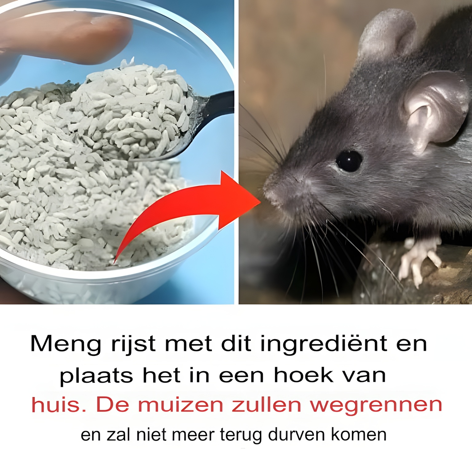 De verleidelijke geur van geroosterde rijst en olie trekt muizen aan, maar het mengsel bevat ook cement, en dat is de sleutel tot deze truc. Zodra muizen dit mengsel eten en het water drinken, stolt het cement in hun spijsverteringsstelsel, wat een dodelijke verstopping veroorzaakt. Resultaat: geen muizen meer in huis!