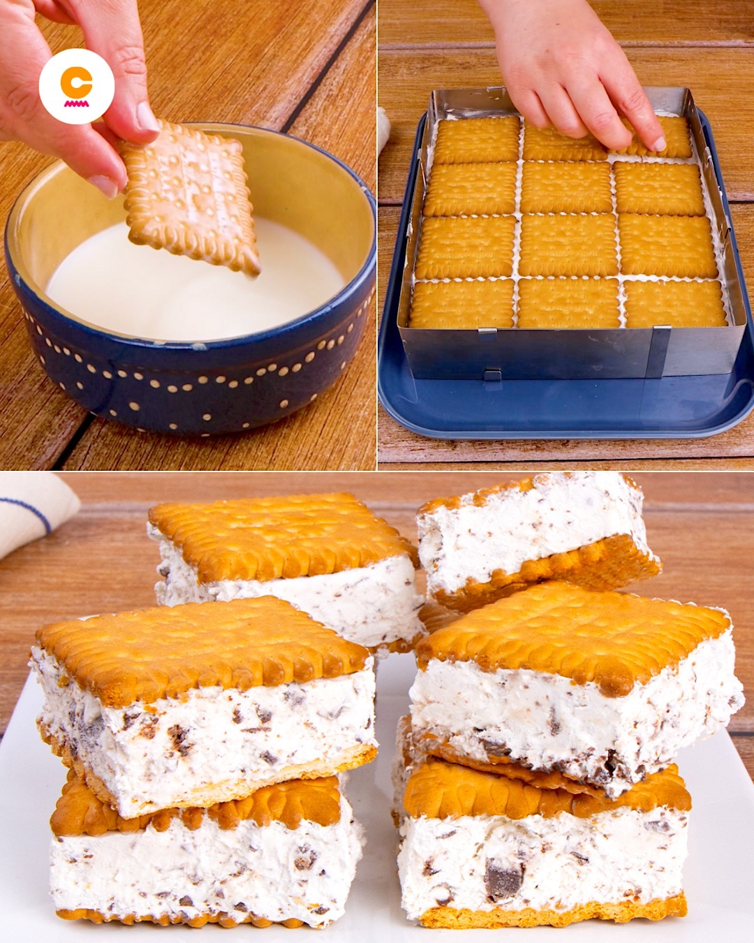 IJskoekjes zijn het perfecte tussendoortje: kleine porties gemaakt van twee laagjes droge koekjes met daartussen een romige vulling van zelfgemaakt stracciatella-ijs, bereid met room, gecondenseerde melk en stukjes pure chocolade.