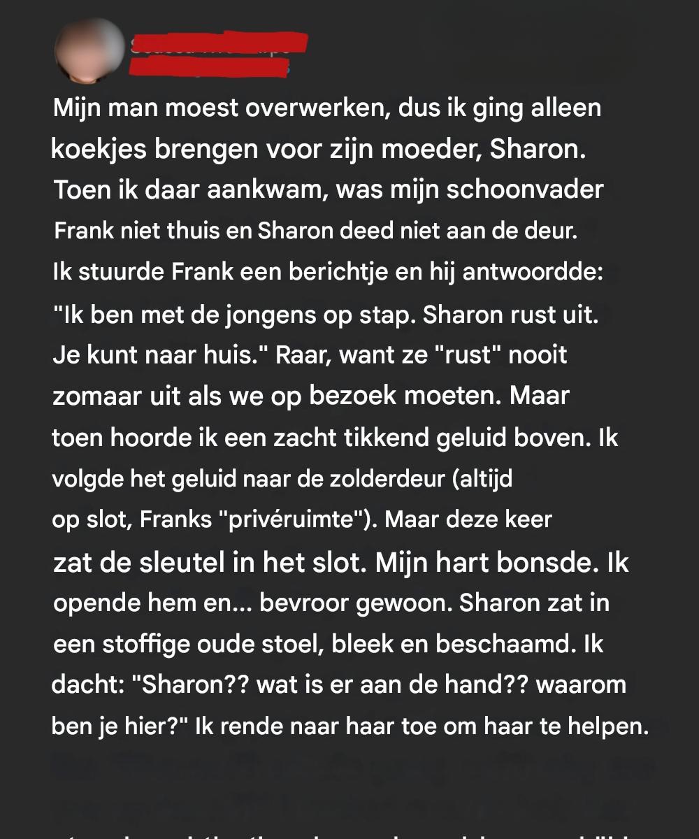 Ik bezocht mijn schoonouders en ontdekte mijn schoonmoeder opgesloten op zolder. Ik werd wit als een laken toen ik erachter kwam waarom.