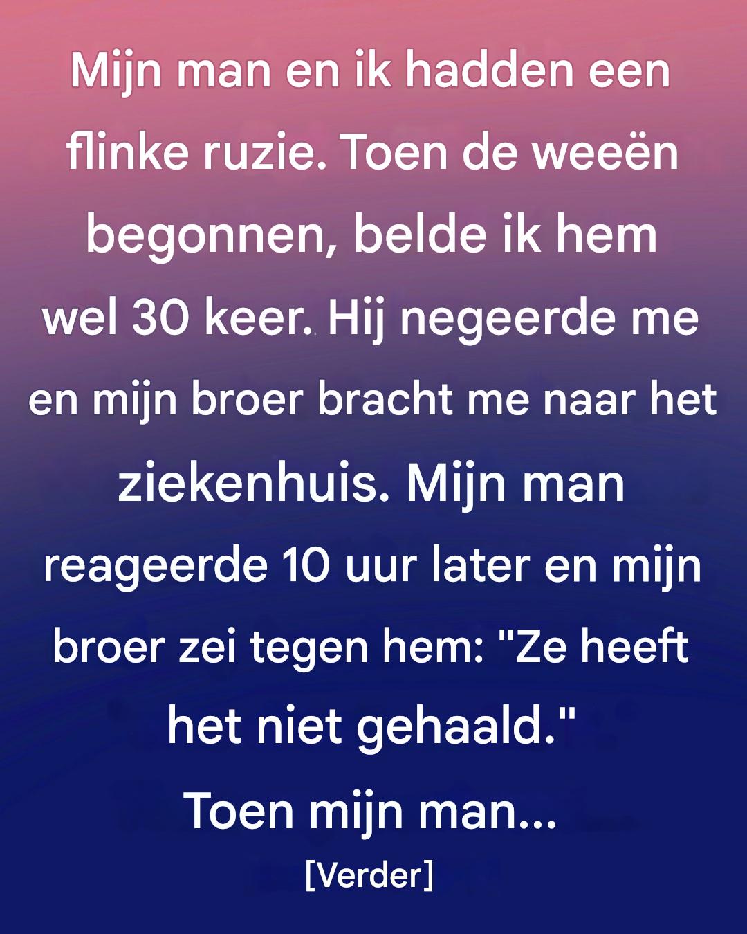 Eerder die avond hadden mijn man en ik ruzie gemaakt – een van die zware, pijnlijke ruzies waarbij stilte dieper snijdt dan woorden. Uren later, toen de weeën begonnen, reikte ik met trillende handen naar mijn telefoon. Paniek en pijn vervaagden samen terwijl ik hem keer op keer belde – dertig keer in totaal. Hij antwoordde nooit.