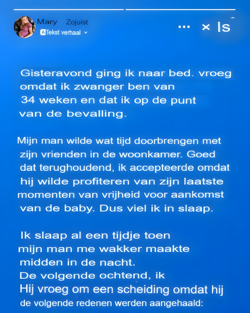 Terwijl ik wacht op de komst van mijn baby, is mijn hart zwaar van verdriet. Ik ben over twee weken uitgerekend en ik twijfel nog tussen het verwelkomen van mijn kleine wondertje op de wereld en het scheiden van mijn man. Mijn naam is Mary, en dit is het verhaal van de noodlottige nacht die alles veranderde…