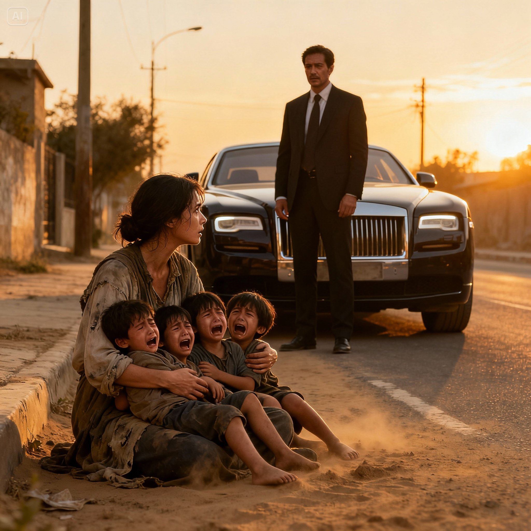 Een kleine menigte begon zich te verzamelen, aangetrokken door de spanning, de luxe auto, de bedelvrouw en de huilende kinderen.
