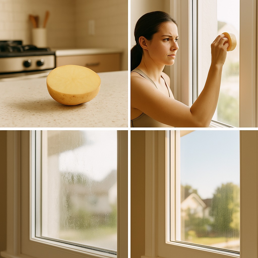 1️⃣ Snijd de aardappel doormidden en wrijf de snijkant direct op het raam of glas.