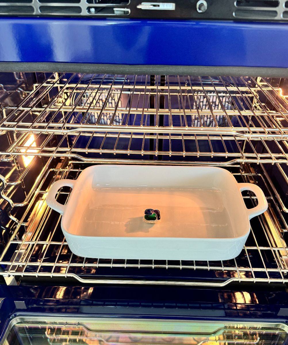 2. Vul, terwijl de oven voorverwarmt, de ovenschaal met water en voeg een vaatwastablet toe.