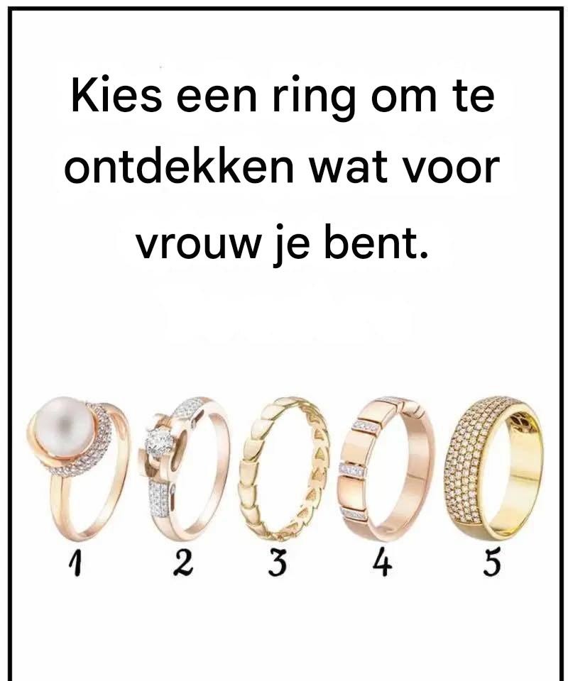 Bekijk de vijf ringen op de afbeelding hierboven en kies de ring die het beste bij je past. Denk er niet te lang over na; kies gewoon de ring die het beste bij je aansluit. Lees na je keuze de onderstaande beschrijving om te ontdekken wat jouw keuze zegt over het type vrouw dat je bent.