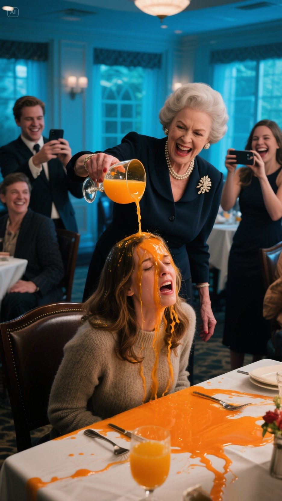 Daniel was aan het filmen met zijn telefoon, grijnzend als een pestkop op het schoolplein. Mijn neven volgden de groep en hieven hun camera’s op. Binnen enkele ogenblikken filmde de helft van de tafel me. Ik zat daar als versteend, sap druipend uit mijn haar op het dure tafelkleed, wat in mijn ogen prikte.